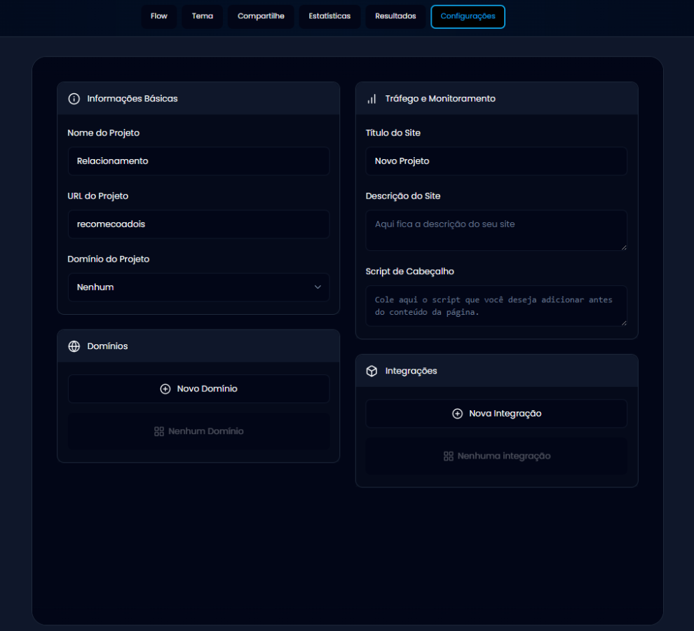 - Novo Domínio: Permite conectar seu próprio domínio (ex: meusite.com) para divulgar o quiz com mais segurança e credibilidade.