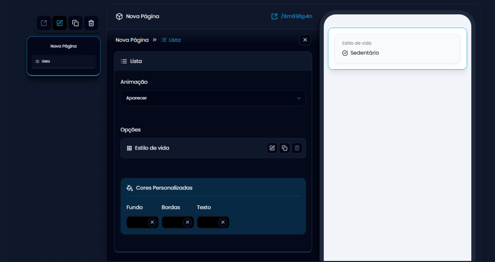 - Itens da lista: adicione múltiplos blocos com título, resultado e ícone.