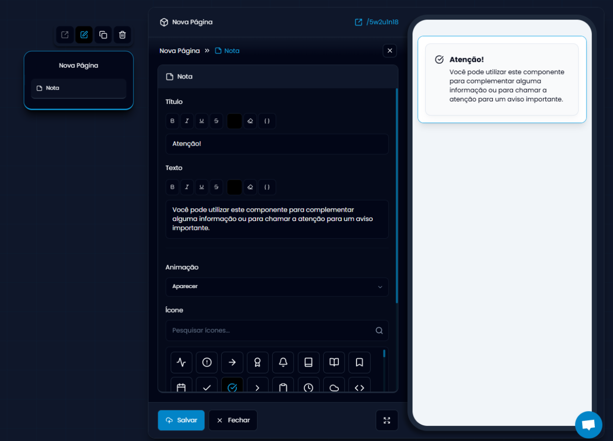 - Ícone: selecione entre diversos ícones visuais que reforçam a ideia da nota (ex: alerta, informação, dica, checklist…).