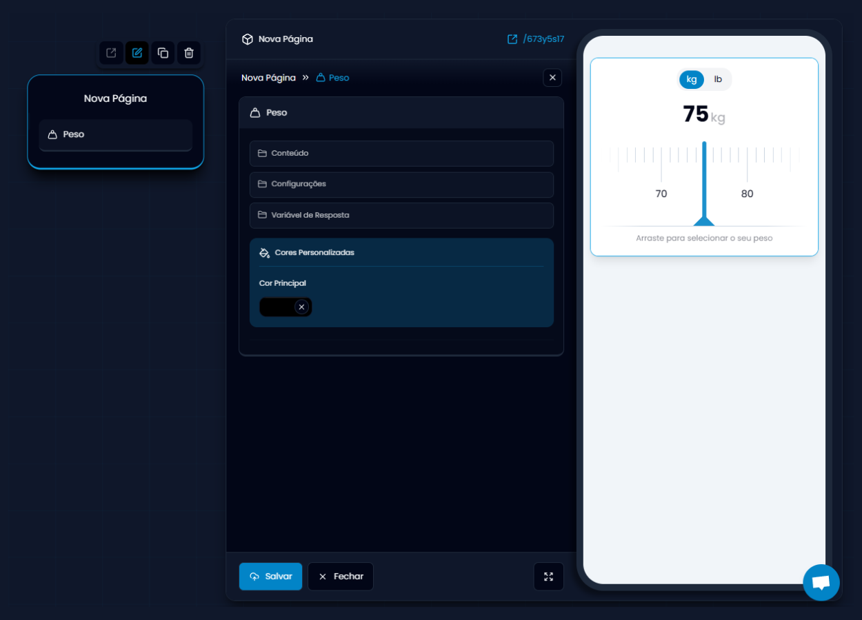 - Texto do rodapé: personalize o texto abaixo do seletor (ex: “Arraste para selecionar o seu peso”).