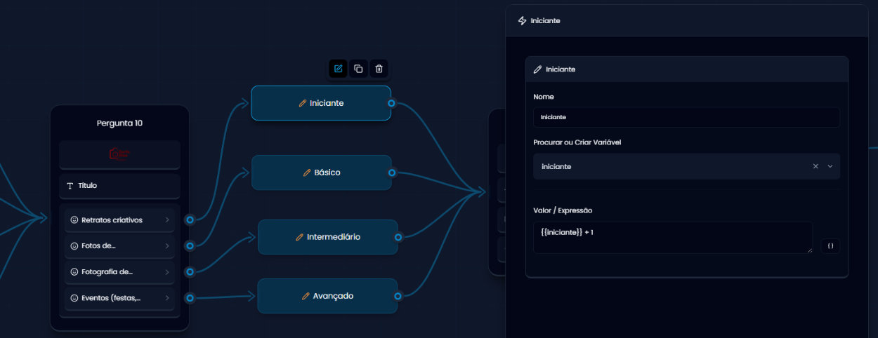 - Valor: o número ou texto que será comparado com o valor da variável.