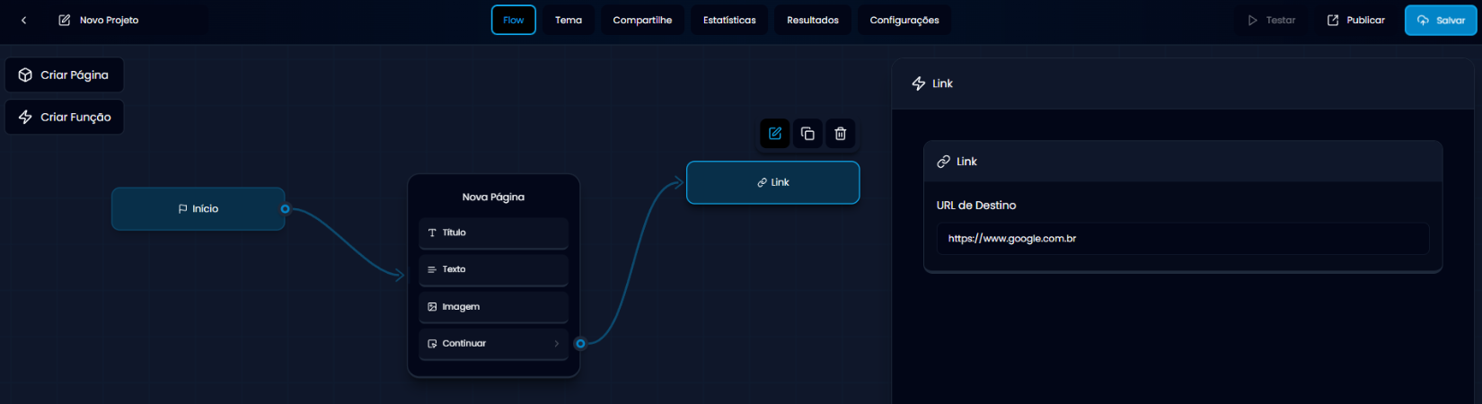 - Insira a URL de destino no campo da função Link (ex: https://www.google.com.br).